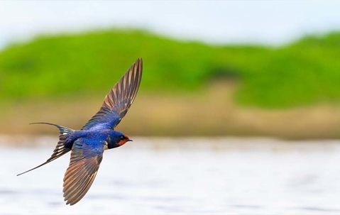 - Swallows: This type of bird is smaller than a pigeon. On average, swallows are about three to nine inches long. Typically, this bird has a combination of blue, dark gray, and red feathers on their bodies and white feathers on their underside.